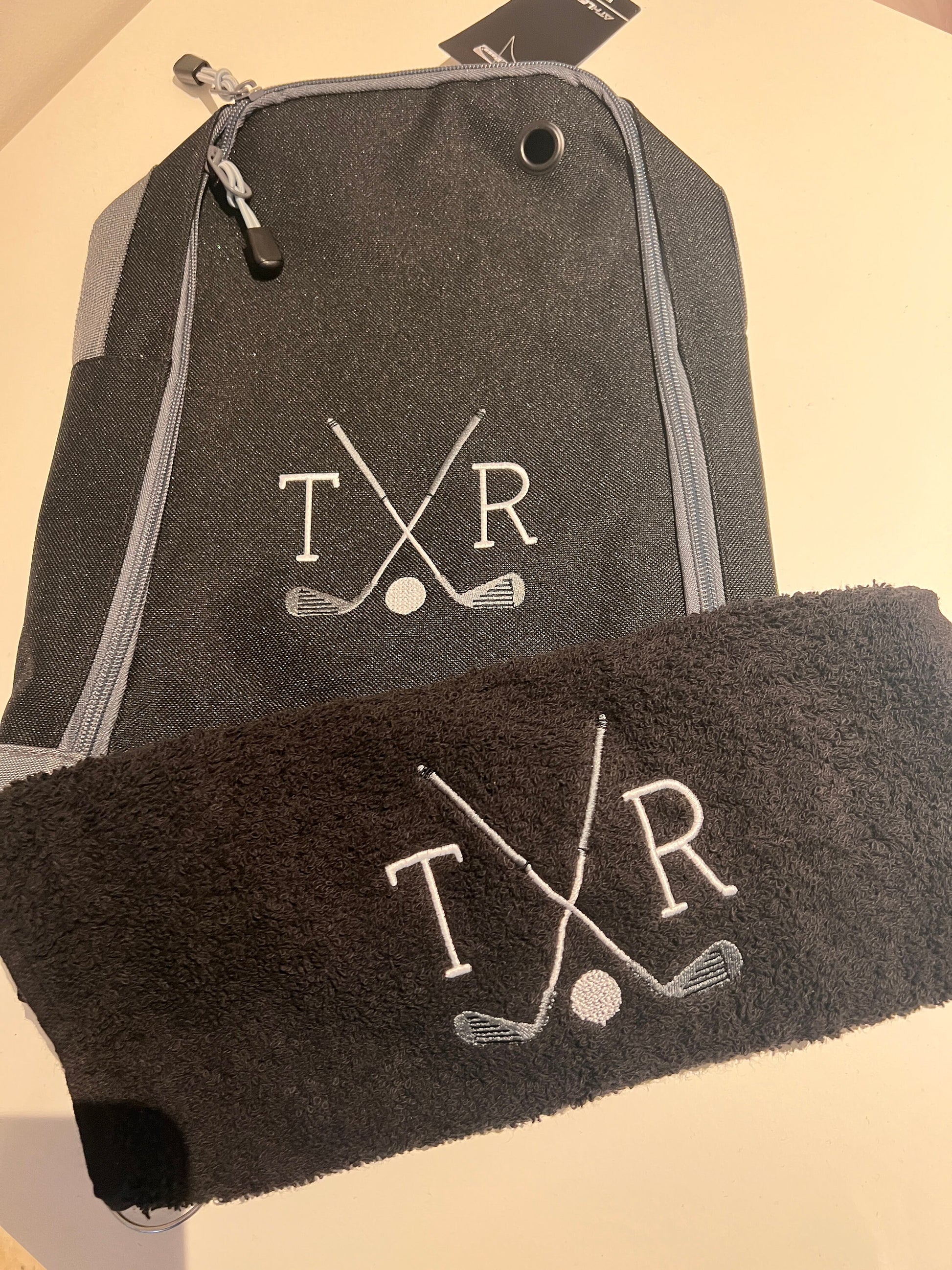 Personalised Embroidered Golf Shoe Bag and Towel all colours mix and match, ideal gift with Golf logo and your initials free P&P