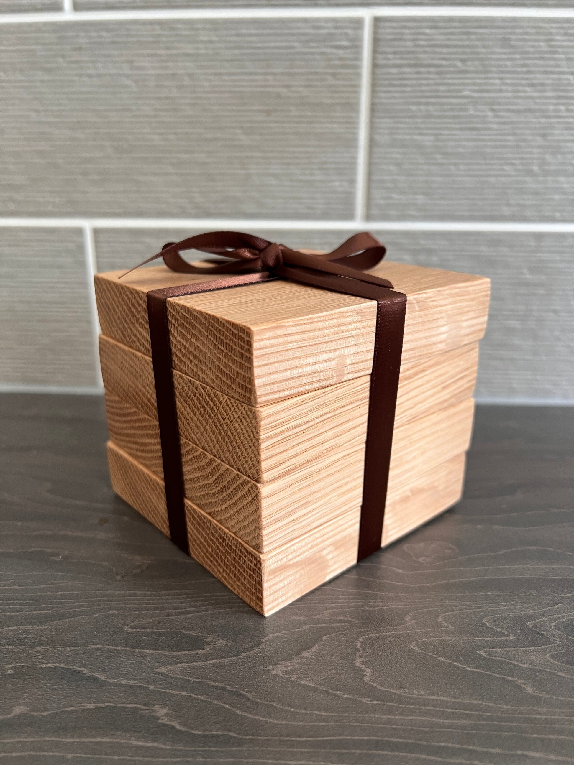 Set of 4 Solid Oak Extra 'Chunky' Square Handmade Coasters with ribbon tie, ideal new home gift