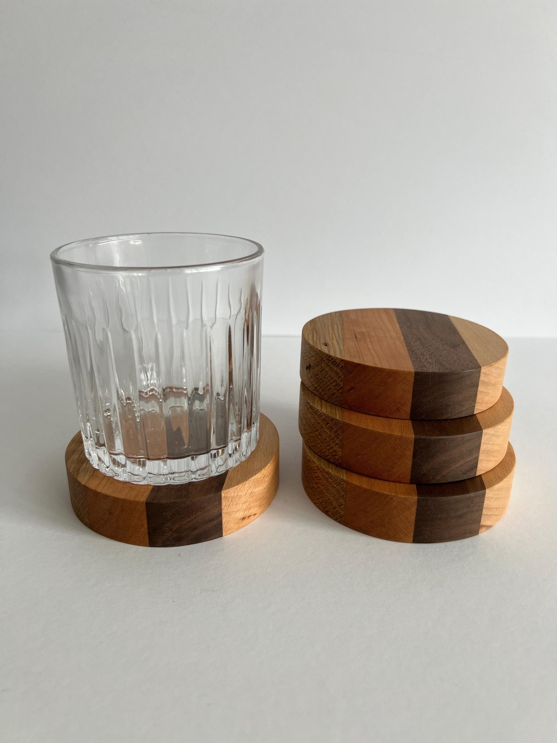 This is a set of 4 Round 'Chunky' mixed hardwood Coasters.