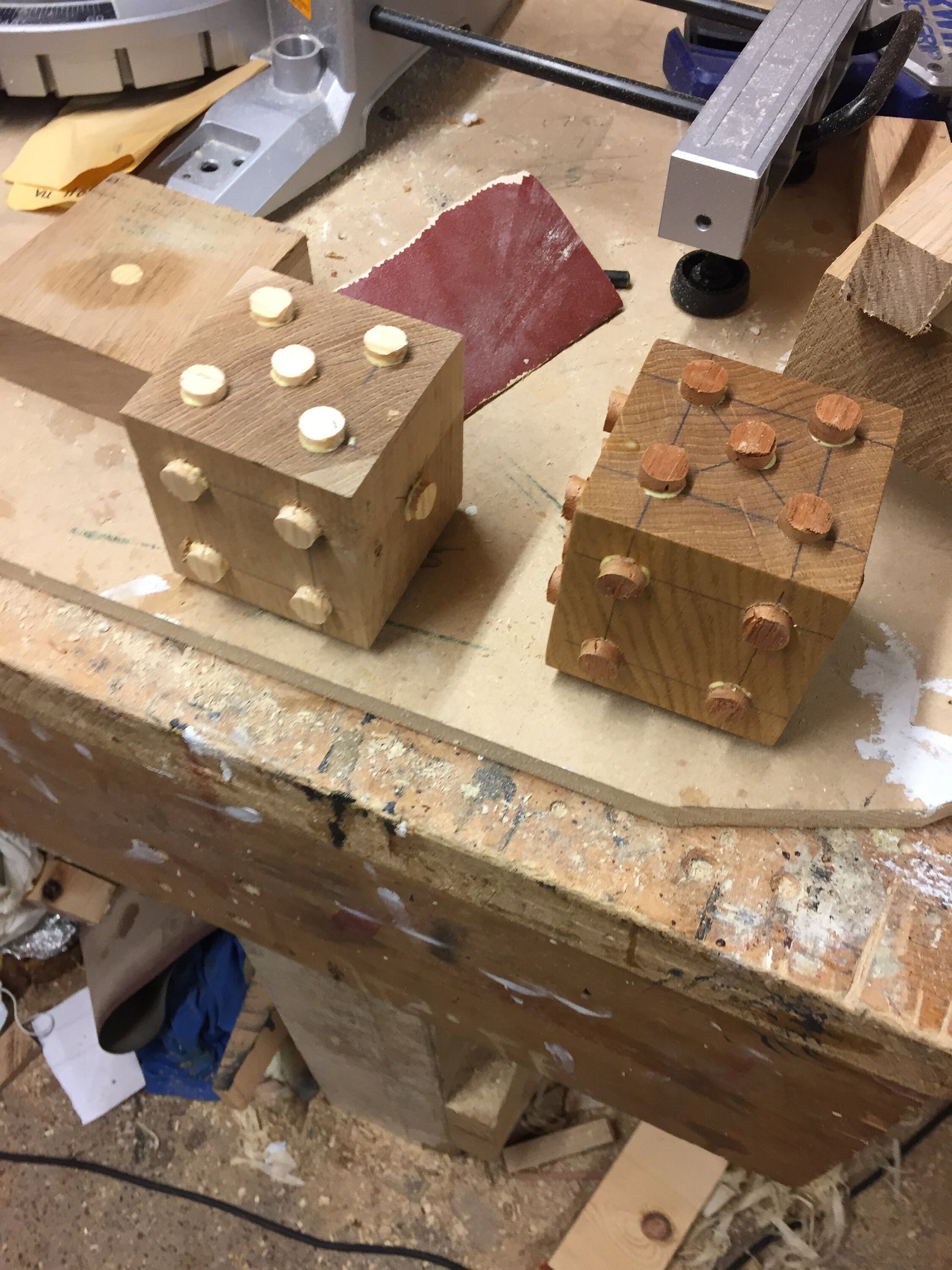 This dice is Douglas fir with pelleted meranti, oak, walnut, beech, American cherry and soft wood spots to give it a unique look for any home decor